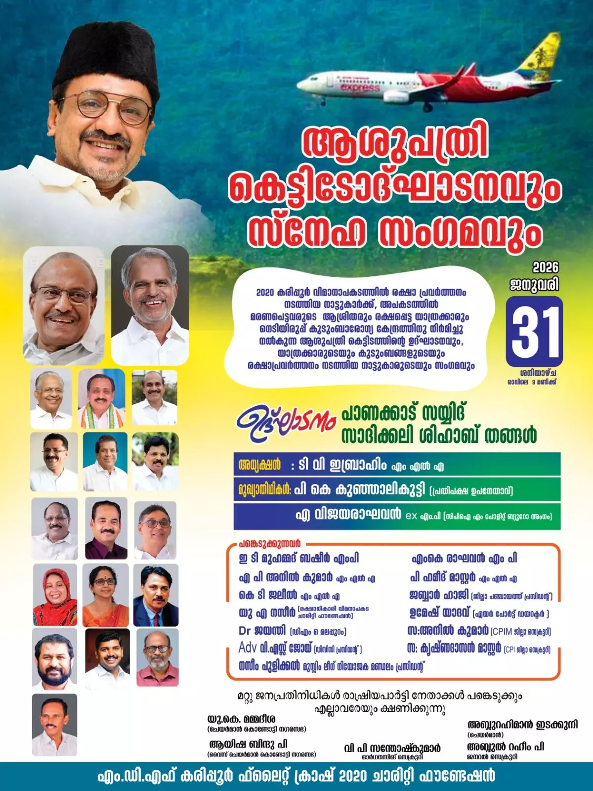 ജനുവരി 31, ശനിയാഴ്ച രാവിലെ 9:00ന് ചിറയില് ചുങ്കം ഫാമിലി ഹെല്ത്ത് സെന്റര്-കൊണ്ടോട്ടി. ഉദ്ഘാടനം: സയ്യിദ് സ്വാദിഖലി ശിഹാബ് തങ്ങള്. അധ്യക്ഷന്: ടി വി ഇബ്രാഹിം എംഎല്എ. മുഖ്യാതിഥികള്: പി കെ കുഞ്ഞാലികുട്ടി(പ്രതിപക്ഷ ഉപനേതാവ്), എ വിജയരാഘവന് മുന് എംപി സിപിഎം പോളിറ്റ് ബ്യൂറോ അംഗം. പങ്കെടുക്കുന്നവര്: ഇ ടി മുഹമ്മദ് ബഷീര് എംപി, എം കെ രാഘവന് എംപി, എ പി അനില്കുമാര് എംഎല്എ, കെ ടി ജലീല് എംഎല്എ, പി ഹമീദ് മാസ്റ്റര് എംഎല്എ, പി എ ജബ്ബാര് ഹാജി(ജില്ലാ പഞ്ചായത്ത് പ്രസിഡന്റ്), യു എ നസീര്(രക്ഷധികാരി വിമനാപകട ചാരിറ്റി ഫൗണ്ടേഷന്).
