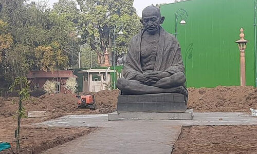 മഹാത്മാഗാന്ധി പ്രതിമ പ്രധാന കവാടത്തില് നിന്ന് മാറ്റിസ്ഥാപിച്ചു: നിര്മാണപ്രവര്ത്തനങ്ങളുടെ ഭാഗമെന്ന് വിശദീകരണം