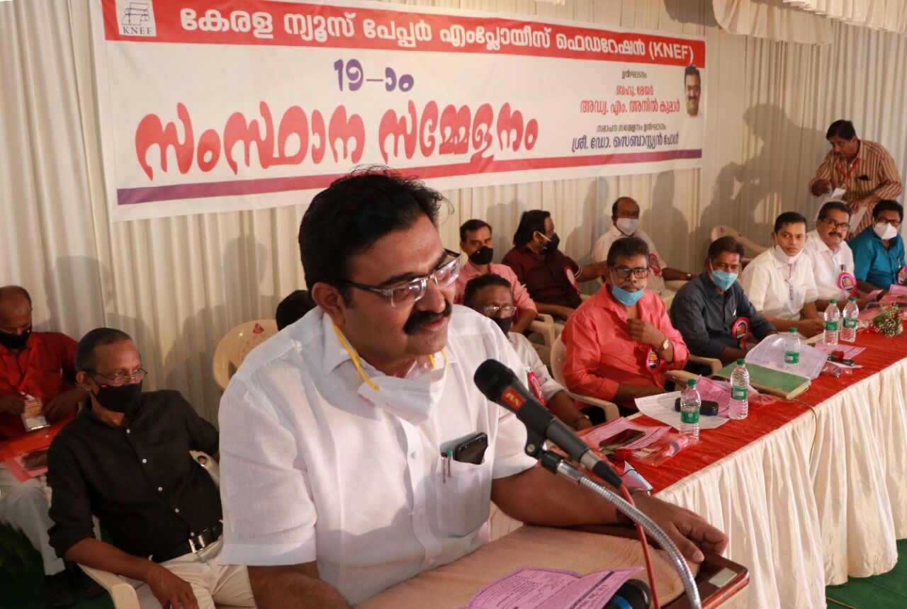 മാധ്യമ പ്രവര്ത്തകര്ക്കുള്ള വേജ് ബോര്ഡ് നിലനിര്ത്തണമെന്നും അദ്ദേഹം പറഞ്ഞു. കെ.എന്.ഇ.എഫ് സംസ്ഥാന പ്രസിഡന്റ് എം സി ശിവകുമാര് അധ്യക്ഷത വഹിച്ചു. ഐഎന്ടിയുസി ജില്ലാ പ്രസിഡന്റ് കെ കെ ഇബ്രാഹിംകുട്ടി, എഐടിയുസി ജില്ലാ സെക്രട്ടറി കെ എന് ഗോപി, ബിജെപി മധ്യമേഖലാ സെകട്ടറി സി ജി രാജഗോപാല്, എഐഎന്ഇഎഫ് അഖിലേന്ത്യാ ജനറല് സെക്രട്ടറി വി ബാലഗോപാല്, പത്രപ്രവര്ത്തക യൂണിയന് സംസ്ഥാന ജനറല് സെക്രട്ടറി ഇ എസ് സുഭാഷ്, എന്ജെപിയു സംസ്ഥാന പ്രസിഡന്റ് പി ദിനകരന്, മേഖലാ പ്രസിഡന്റ് കെ എന് ലതാനാഥന്, എഐഎന്ഇഎഫ് ഓര്ഗനൈസിംഗ് സെക്രട്ടറി ഗോപന് നമ്പാട്ട്, കെഎന്ഇഎഫ് സംസ്ഥാന ജനറല് സെക്രട്ടറി സി മോഹനന് എ അജിത്കുമാര്, എം ടി വിനോദ്കുമാര് സംസാരിച്ചു. പ്രതിനിധി സമ്മേളനത്തില് ജനറല് സെക്രട്ടറി സി മോഹനന് പ്രവര്ത്തന റിപ്പോര്ട്ടും ട്രഷറര് എം ഫൈറൂസ് കണക്കും അവതരിപ്പിച്ചു. രക്തസാക്ഷി പ്രമേയം കെ കെ സോമനും അനുശോചന പ്രമേയം ആര് ബിജുവും, പ്രമേയങ്ങള് പി അനില്കുമാറും അവതരിപ്പിച്ചു. സമാപന സമ്മേളനം ഡോ. സെബാസ്റ്റ്യന് പോള് ഉദ്ഘാടനം ചെയ്തു.