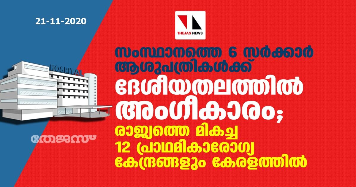 സംസ്ഥാനത്തെ 6 സര്ക്കാര് ആശുപത്രികള്ക്ക് ദേശീയതലത്തില് അംഗീകാരം; രാജ്യത്തെ മികച്ച 12 പ്രാഥമികാരോഗ്യ കേന്ദ്രങ്ങളും കേരളത്തില്