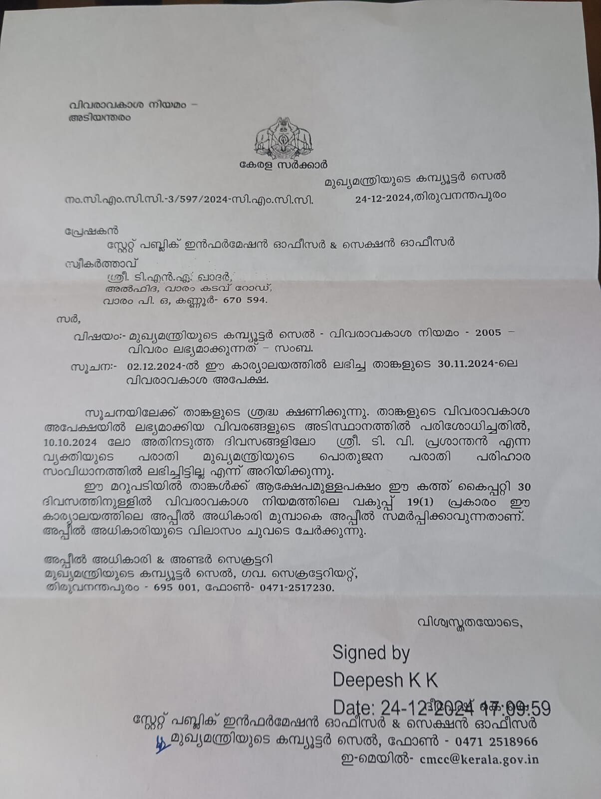 നവീന്ബാബുവിന്റെ മരണം: ടി വി പ്രശാന്തന്റെ പരാതി മുഖ്യമന്ത്രിയുടെ പരാതി പരിഹാര സെല്ലിന് ലഭിച്ചിട്ടില്ലെന്ന് മുഖ്യമന്ത്രിയുടെ ഓഫിസ്