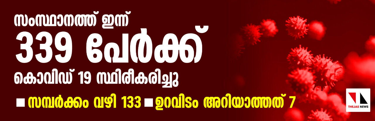 സംസ്ഥാനത്ത് ഇന്ന് 339 പേര്ക്ക് കൊവിഡ് സ്ഥിരീകരിച്ചു, 133 പേര്ക്ക് സമ്പര്ക്കം വഴി രോഗബാധ