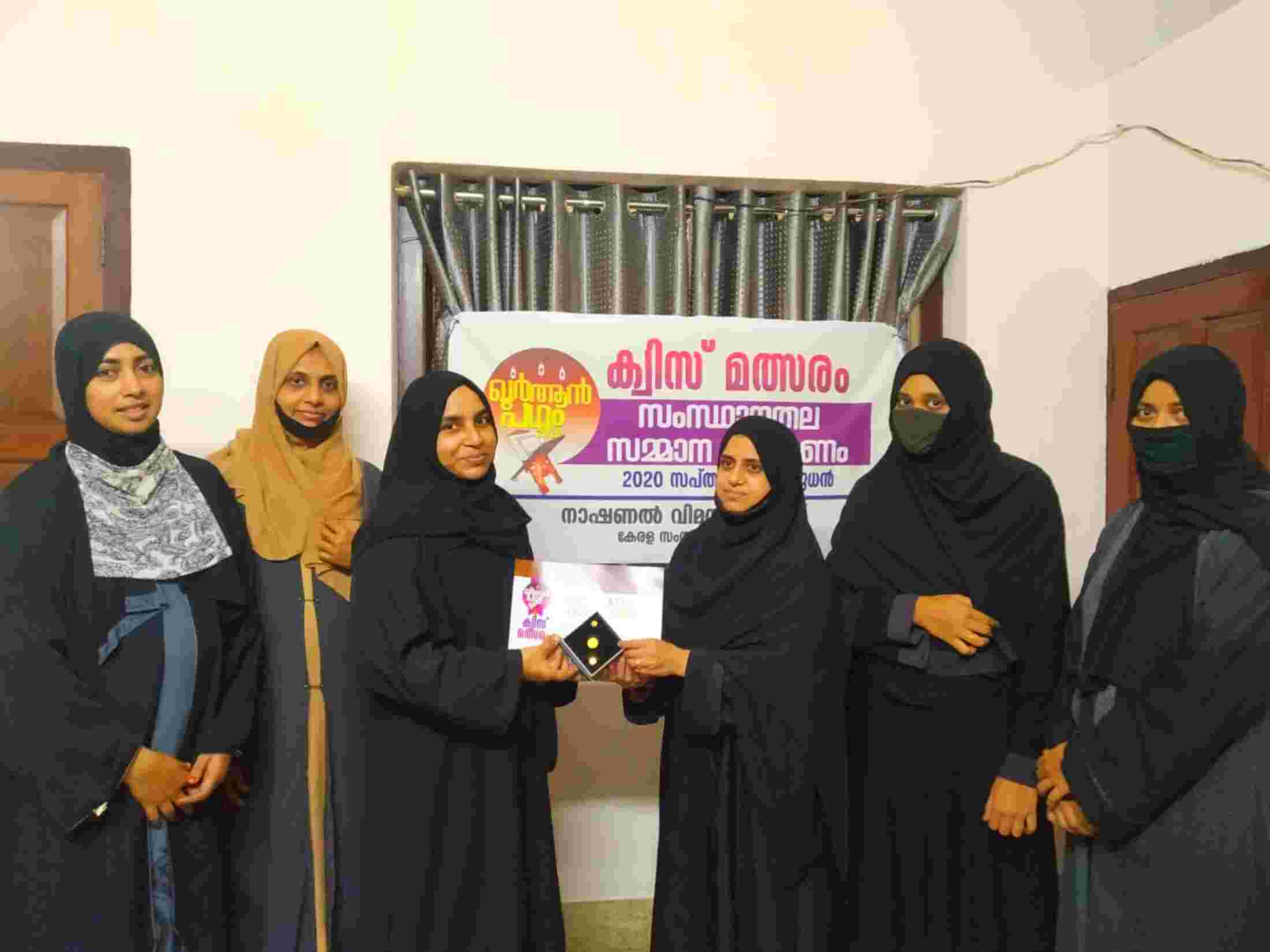 സംസ്ഥാനതലത്തിൽ ഒന്നാം സ്ഥാനം കരസ്ഥമാക്കിയ ശബാന അബ്ബാസിന് (കണ്ണൂർ) 3 ഗ്രാം സ്വർണ നാണയം നാഷണൽ വിമൻസ് ഫ്രണ്ട് സംസ്ഥാന ജനറൽ സെക്രട്ടറി ടി.ഷാഹിനയും രണ്ടാംസ്ഥാനം കരസ്ഥമാക്കിയ അസ് ലിയക്ക് (മലപ്പുറം) 2 ഗ്രാം സ്വർണനാണയം സംസ്ഥാന പ്രസിഡന്റ് എം ഹബീബയും മൂന്നാംസ്ഥാനം നേടിയ ഫാത്തിമ ടി എ യ്ക്ക് (ആലപ്പുഴ) 1 ഗ്രാം സ്വർണനാണയം സംസ്ഥാന സമിതി അംഗം ഡോ.ഫൗസീന തക്ബീറും സമ്മാനിച്ചു.