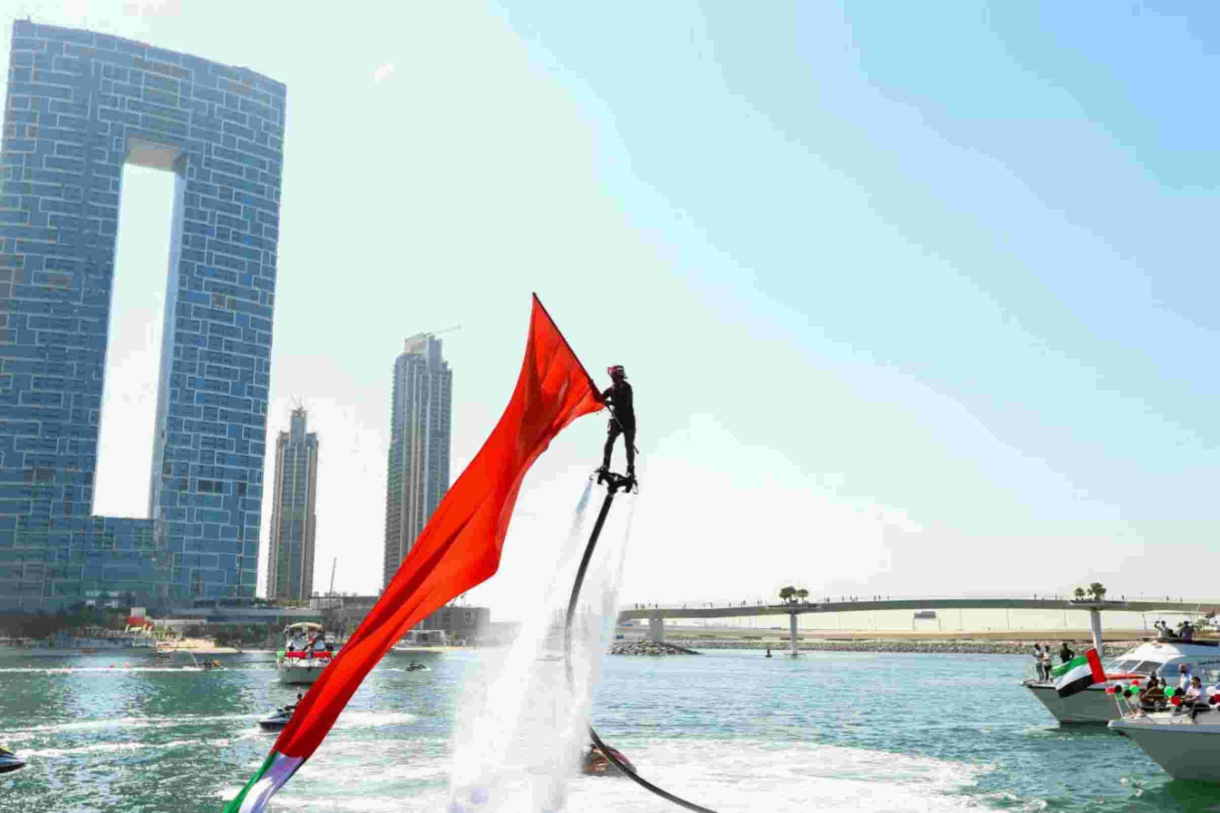 നിരവധി ആഡംബര യാട്ടുകളും, വാട്ടര് ബൈക്കുകളും, വാട്ടര് ഫ്ളൈ ബോര്ഡുകളുമുള്പ്പെടെ രണ്ട് ഡസനിലധികം ജലയാനങ്ങള് പരേഡില് അണിനിരന്നു. ഗ്രാന്ഡ് യോട്ട് ഷോ ഉള്പ്പെടെ നിരവധി ആവേശകരമായ ആക്റ്റീവിറ്റികളുള്ളതായിരുന്നു ഈ മെഗാ ഇവന്റ്. ദുബൈയിലെ ജലകേളികളുടെ തലസ്ഥാനം എന്നറിയപ്പെടുന്ന മറീനയില് നിന്നും ആരംഭിച്ച് ദേശീയ സംഗീതത്തിന്റെ അകമ്പടിയോടെയുള്ള യോട്ട് പരേഡ് ഏതാനും കിലോമീറ്ററുകള് സഞ്ചരിച്ച് കടലിനോട് ചേര്ന്ന് വൃത്താകൃതിയില് സംഗമിച്ചു. തുടര്ന്ന് അഭ്യാസപ്രകടനങ്ങളോടെ യുഎഇ ദേശീയ പതാക ഉയര്ത്തുന്ന ചടങ്ങുകള് ആരംഭിച്ചു. മുഖ്യതിഥികളായി ചടങ്ങില് പങ്കെടുത്ത ദുബൈ ഡിപാര്ട്മെന്റ് ഓഫ് ടൂറിസം ആന്റ് കോമേര്സ് മാര്ക്കറ്റിങ്ങ് (DTCM) ഡയറക്ടര് ഷൈഖ ഇബ്രാഹിം അല് മുത്തവ, കമ്യൂണിറ്റി അഫേര്സ് ആന്റ് വിസ-ഇന്ത്യന് കോണ്സുല് ഉത്തം ചന്ദ് എന്നിവര് ചേര്ന്ന് പ്രശസ്ത ഫ്ളൈ ബോര്ഡ് അഭ്യാസിയായ അലി ബിന് ദാലിദിന് യൂഎഇ ദേശീയ പതാക കൈമാറി. അലി ബിന് ദാലിദിന്റെ നേതൃത്വത്തില് ദേശീയ പതാക ജലപ്പരപ്പില് ഏറ്റവും ഉയര്ന്ന പോയിന്റില് ഉയര്ത്തപ്പെട്ടു.