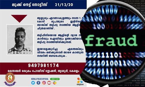 1.5 കോടിയുടെ ഇന്റര്നെറ്റ് ബാങ്കിങ് തട്ടിപ്പ്; പ്രതിക്കായി ലുക്ക് ഔട്ട് നോട്ടിസ് പുറപ്പെടുവിച്ചു
