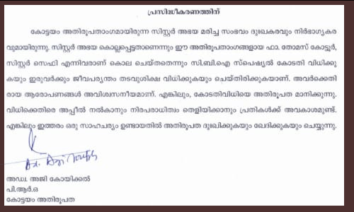 കോട്ടയം അതിരൂപതാംഗമായ സിസ്റ്റര് അഭയ മരിച്ച സംഭവം ദുഃഖകരവും നിര്ഭാഗ്യകരവുമായിരുന്നു. സിസ്റ്റര് അഭയ കൊല്ലപ്പെട്ടതാണെന്നും ഈ അതിരൂപാംഗങ്ങളായ ഫാ. തോമസ് കാട്ടൂര്, സിസ്റ്റര് സെഫി എന്നിവരാണ് കൊല ചെയ്തതെന്നും സി.ബി.ഐ സ്പെഷ്യല് കോടതി വിധിക്കുകയും ഇരുവര്ക്കും ജീവപര്യന്തം തടവുശിക്ഷ വിധിക്കുകയും ചെയ്തിരിക്കുകയാണ്. അവര്ക്കെതിരായ ആരോപണങ്ങള് അവിശ്വസനീയമാണ്. എങ്കിലും കോടതിവിധിയെ അതിരൂപത മാനിക്കുന്നു. വിധിക്കെതിരെ അപ്പീല് നില്കാനും നിരപരാധിത്വം തെളിയിക്കാനും പ്രതികള്ക്ക് അവകാശമുണ്ട്. എങ്കിലും ഇത്തരം ഒരു സാഹചര്യം ഉണ്ടായതില് അതിരൂപത ദുഃഖിക്കുകയും ഖേദിക്കുയും ചെയ്യുന്നു.