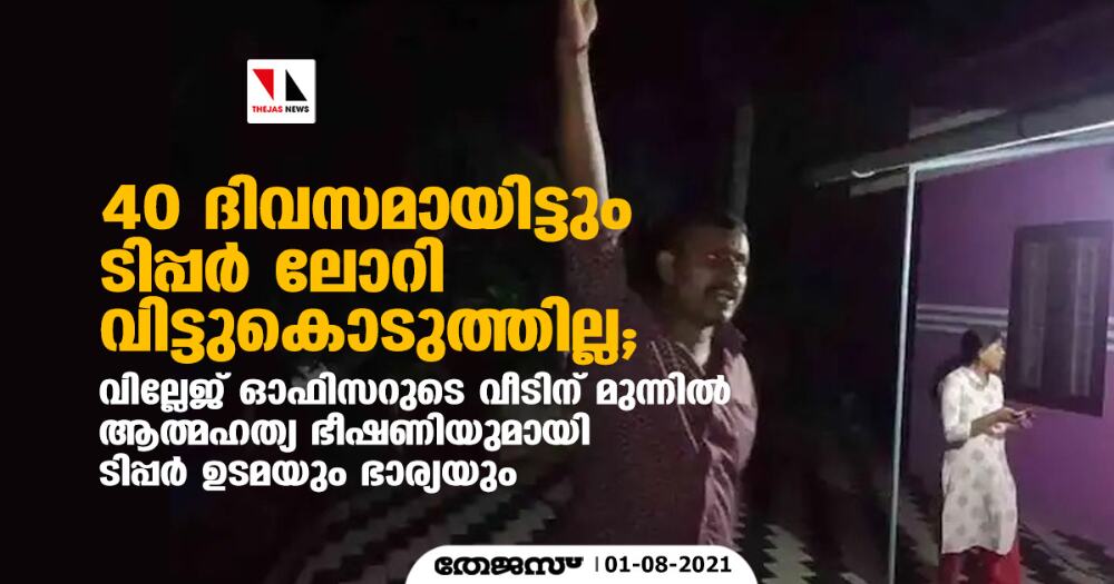 40 ദിവസമായിട്ടും ടിപ്പര് ലോറി വിട്ടുകൊടുത്തില്ല; വില്ലേജ് ഓഫിസറുടെ വീടിന് മുന്നില് ആത്മഹത്യ ഭീഷണിയുമായി ടിപ്പര് ഉടമയും ഭാര്യയും