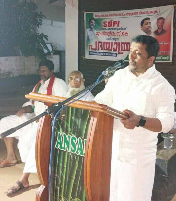 കോഴിക്കോട് : ഇ. വി. എം. തട്ടിപ്പിലൂടെയും കൃത്രിമ വോട്ടർ പട്ടികയിലൂടെയും വോട്ട് കൊള്ള നടത്തി അധികരത്തിലേറിയ നരേന്ദ്രമോഡിക്ക് പ്രധാനമന്ത്രിയായി തുടരാൻ ധാർമികാവകാശമില്ലെന്ന് എസ്. ഡി. പി. ഐ. കോഴിക്കോട് ജില്ലാ വൈസ് പ്രസിഡണ്ട് അബ്ദുൽ ജലീൽ സഖാഫി പ്രസ്താവിച്ചു."വോട്ട് കൊള്ളക്കാരിൽ നിന്ന് രാജ്യത്തെ വീണ്ടെടുക്കുക" എന്ന പ്രമേയത്തിൽ എസ്. ഡി. പി. ഐ സംസ്ഥാന വ്യാപകമായി നടത്തുന്ന കാമ്പയിൻ്റെ ഭാഗമായി ചാത്തമംഗലം പഞ്ചായത്ത് കമ്മറ്റി പ്രസിഡന്റ് മുഹിയുദീൻ സി. കെ. നയിക്കുന്ന പദയാത്ര യുടെ സമാപന സമ്മേളനം ഉത്ഘാടനം ചെയ്തു സംസാരിക്കുകയായിരുന്നു അദ്ദേഹം. സി. മുഹമ്മദ് മാസ്റ്റർ അദ്യക്ഷത വഹിച്ചു. കൂളിമാട് നിന്ന് പ്രായണമാരംഭിച്ച പദയാത്ര ജാഥാ ക്യാപ്റ്റന് പതാക കൈമാറി ജില്ലാ കമ്മിറ്റി അംഗം ടി. പി. മുഹമ്മദ് ഉത്ഘാടനം ചെയ്തു. മണ്ഡലം ട്രഷറർ മുഹമ്മദ് നദ്വി, ജോൻ സിക്രട്ടറി കബീർ കെ. കെ., പഞ്ചായത്ത് സിക്രട്ടറി സിനാൻ, വൈസ് പ്രസിഡൻ്റ് ഫാരിസ്, ട്രഷറർ പി. സിദ്ദീഖ്, കെ. എം. ബഷീർ നേതൃത്വം നൽകി. ഇ . പി. ഷുക്കൂർ, ഹബീബ് ടീ. വി. ജാഥാ ക്യാപ്റ്റന് ഹാരാർപ്പണം നടത്തി. ജാഥാ ക്യാപ്റ്റൻ മുഹിയുദീൻ സി. കെ. സ്വീകരണത്തിന് നന്ദി പറഞ്ഞു.