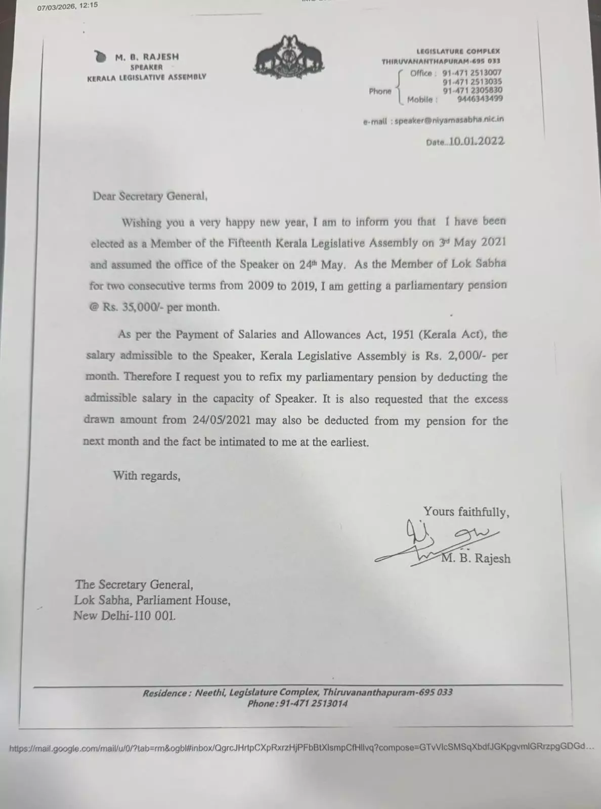 സത്യം ഇതാണ്. നിയമസഭാ സ്പീക്കറായ ശേഷം 10.1.2022 ന് ലോക്സഭാ സെക്രട്ടറി ജനറലിന് ഞാന് സ്പീക്കറെന്ന നിലയില് ശമ്പളം കൈപ്പറ്റുന്ന കാര്യം അറിയിച്ചു കൊണ്ടും, അതു കുറച്ച് എന്റെ പെന്ഷന് നിയമ പ്രകാരം പുനര് നിശ്ചയിക്കണമെന്നും, ഏതാനും മാസം അധികമായി എന്റെ അക്കൗണ്ടിലേക്ക് ലോക്സഭാ സെക്രട്ടേറിയറ്റില് നിന്ന് അയച്ച തുക റലറൗര േചെയ്യണമെന്നും അറിയിച്ച് കത്തയച്ചിട്ടുണ്ട്. അതായത് നാലു വര്ഷം മുമ്പ് തന്നെ ഞാന് ഇക്കാര്യം അങ്ങോട്ട് അറിയിച്ചു എന്നര്ത്ഥം. പിന്നീട് മന്ത്രിയായ ശേഷം ഇക്കാര്യങ്ങള് ആവര്ത്തിച്ച് 17.02.2023ന് ഞാന് വീണ്ടും ലോക്സഭാ സെക്രട്ടേറിയറ്റിന് കത്ത് നല്കി. തുടര്ന്ന് എന്റെ കത്തിന്റെ അടിസ്ഥാനത്തില് ശമ്പളം കുറച്ച് പെന്ഷന് നിയമപ്രകാരം പുന:ക്രമീകരിച്ചതായും, അതിനു മുമ്പ് നല്കിയ ഏതാനും മാസത്തെ തുക കുറവു ചെയ്തതായും അറിയിച്ച് എനിക്ക് 22.05.23 ന് ലോക്സഭാ സെക്രട്ടേറിയറ്റ് മറുപടിയും നല്കി. അതായത് ഒരു നിയമ ലംഘനവും ഇല്ല എന്നര്ത്ഥം. രേഖകളെല്ലാം ഇവിടെ പങ്കുവെക്കുന്നു.