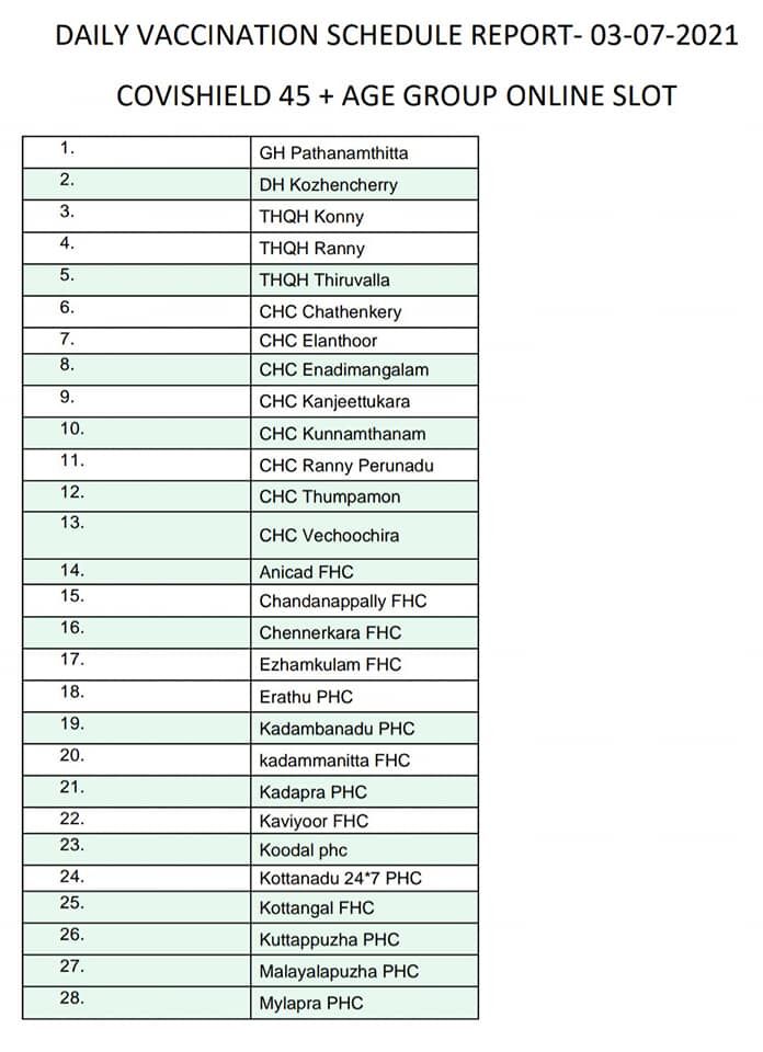 പത്തനംതിട്ട: ജില്ലയിലെ സ്ലോട്ട് ബുക്കിംഗ് ഇന്ന് വൈകിട്ട് 7 മുതല് 7.30 വരെ