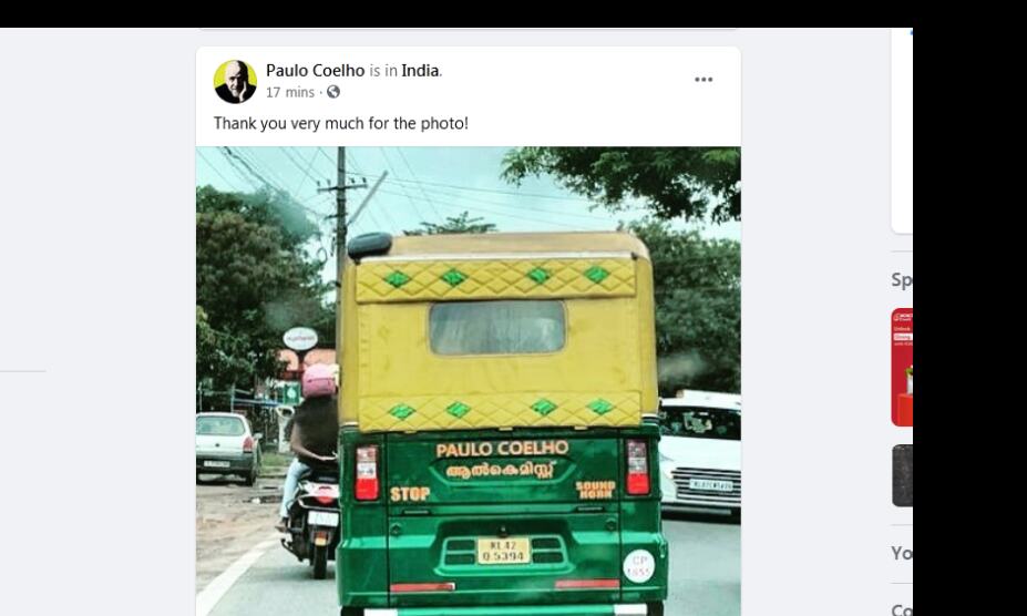 'ആല്കെമിസ്റ്റി' ന്റെ പേരെഴുതിയ ഓട്ടോറിക്ഷയുടെ ചിത്രം പങ്കുവച്ച് പൗലോ കൊയ്ലോ