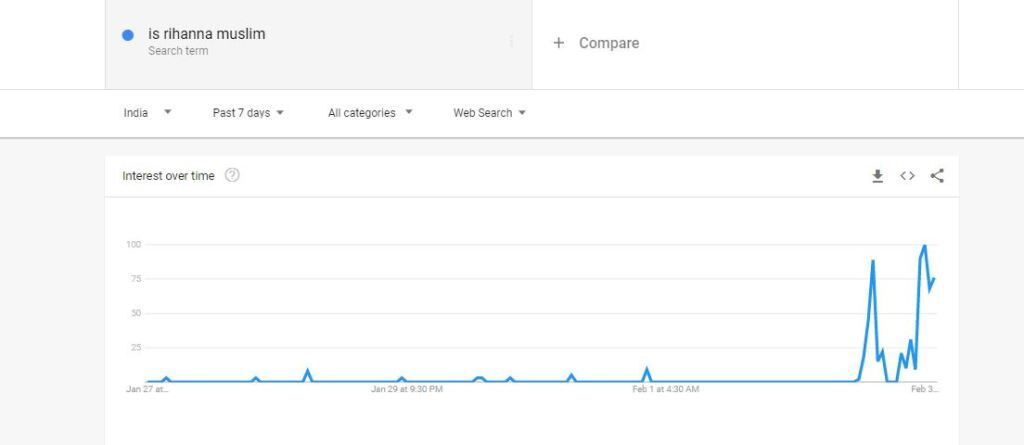 ഫെബ്രുവരി 2 ാം തിയ്യതി 8.59നാണ് റിഹാന സിഎന്എന്ന്റെ ന്യൂസ് ആര്ട്ടിക്കിള് ട്വറ്ററില് പങ്കുവച്ചത്. മിനിറ്റുകള്ക്കുളളില് റിഹാനയെക്കുറിച്ച് ഇന്ത്യക്കാര് ഗൂഗിളില് തിരച്ചിലാരംഭിച്ചു. റിയാന ആരാണെന്നാണ് പലരും തിരഞ്ഞത്. 'റിഹാന മുസ്ലിമാണോ?' എന്നതായിരുന്നു മുഖ്യമായ മറ്റൊരു തിരച്ചില് വാക്ക്. മറ്റൊന്ന് 'റിഹാന റിലീജിയന്' എന്നും.