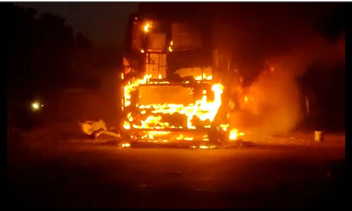 ഹൈദരാബാദില് നിന്ന് പ്രകാശം ജില്ലയിലെ ചിരാലയിലേക്ക് പോവുകയായിരുന്ന വോള്വോ ബസാണ് അപകടത്തില്പ്പെട്ടത്. ബസ് പൂര്ണ്ണമായും കത്തി നശിച്ചു. 30 യാത്രക്കാരാണ് ബസില് ഉണ്ടായിരുന്നത്. തീപടരുന്നത് കണ്ടയുടന് ഡ്രൈവര് ജാഗ്രതാ നിര്ദേശം നല്കുകയും,എല്ലാ യാത്രക്കാരെയും സുരക്ഷിതമായി ഇറക്കുകയും ചെയ്തതിനാല് വലിയ അപകടം ഒഴിവായി.