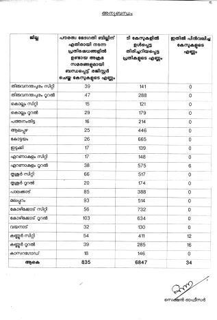 തിരുവനന്തപുരം 39, തിരുവനന്തപുരം റൂറല് 47, കൊല്ലം സിറ്റി 15, കൊല്ലം റൂറല് 29, പത്തനംതിട്ട 16, ആലപ്പുഴ 25, കോട്ടയം 26, ഇടുക്കി 17, എറണാകുളം സിറ്റി 17, എറണാകുളം റൂറല് 38, തൃശൂര് സിറ്റി 66, തൃശൂര് റൂറല് 20, പാലക്കാട് 85, മലപ്പുറം 93, കോഴിക്കോട് സിറ്റി 56, കോഴിക്കോട് റൂറല് 103, വയനാട് 32, കണ്ണൂര് സിറ്റി 54, കണ്ണൂര് റൂറല് 39, കാസര്കോഡ് 18 എന്നിങ്ങനെയാണ് ജില്ല തിരിച്ച കണക്ക്.