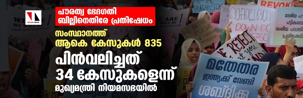 പൗരത്വ ഭേദഗതി ബില്ലിനെതിരേ പ്രതിഷേധം: സംസ്ഥാനത്ത് ആകെ കേസുകള് 835, പിന്വലിച്ചത് 34 കേസുകളെന്ന് മുഖ്യമന്ത്രി