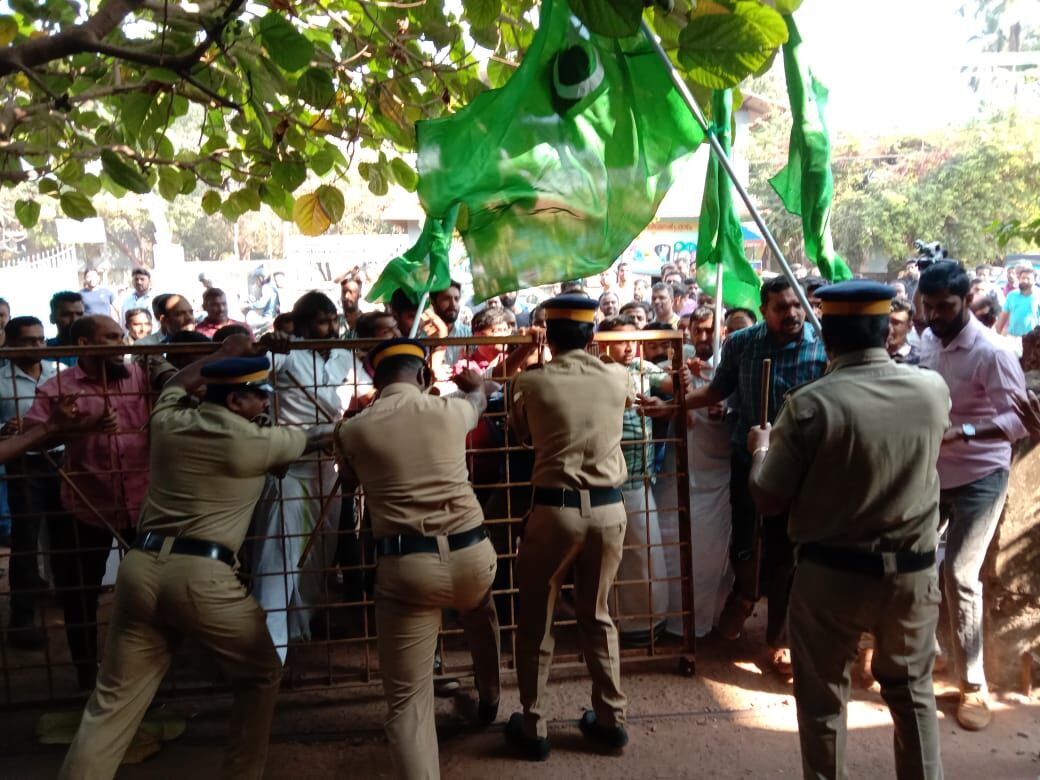 എന്പിആര് വിവര ശേഖരണത്തില് ചട്ടവിരുദ്ധ പ്രവര്ത്തനം നടത്തിയ മഞ്ചേരി നഗരസഭ സെക്രട്ടറിയെ പുറത്താക്കണമെന്നാവശ്യപ്പെട്ടാണ് ഉപരോധം. പ്രതിഷേധത്തില് സെക്ട്രട്ടറിയുടെ കാബിന് അടക്കമുള്ളവയ്ക്കു നാശനഷ്ടമുണ്ടായി. രാവിലെ ഒമ്പതു മണിയോടെ യൂത്ത് കോണ്ഗ്രസ് പ്രവര്ത്തകരാണ് ആദ്യം പ്രതിഷേധവുമായെത്തിയത്. പിന്നീട് യൂത്ത് ലീഗിന്റെ ആഭിമുഖ്യത്തില് പ്രവര്ത്തകരെത്തിയതോടെ പ്രതിഷധം രൂക്ഷമായി. മുസ്ലിം ലീഗ് ഓഫിസ് പരിസരത്ത് നിന്നാരംഭിച്ച മാര്ച്ച് നഗരസഭാ കവാടത്തിന് പുറത്ത് പോലിസ് തടയാന് ശ്രമിച്ചെങ്കിലും പ്രവര്ത്തകര് ബാരിക്കേഡ് തള്ളിമാറ്റി അകത്തു കയറി. തുടര്ന്ന് സെക്രട്ടറിയുടെ ഓഫിസിനു മുന്നിലേക്ക് മുദ്രാവാക്യം വിളികളുമായി ഇരച്ചെത്തിയ പ്രവര്ത്തകരെ പോലിസെത്തി പ്രവര്ത്തകരെ നീക്കം ചെയ്യാന് ശ്രമിച്ചെങ്കിലും പ്രവര്ത്തകര് പിന്മാറാന് തയ്യാറായില്ല. ഇത് സംഘര്ഷത്തിനിടയാക്കി. പ്രവര്ത്തകര്