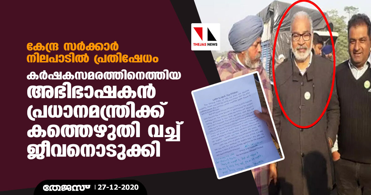കേന്ദ്ര സര്ക്കാര് നിലപാടില് പ്രതിഷേധം: കര്ഷകസമരത്തിനെത്തിയ അഭിഭാഷകന് പ്രധാനമന്ത്രിക്ക് കത്തെഴുതി വച്ച് ജീവനൊടുക്കി