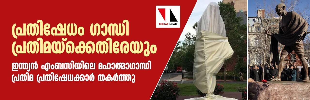 പ്രതിഷേധം മഹാത്മാഗാന്ധി പ്രതിമയ്ക്കെതിരേയും; ഇന്ത്യന് എംബസിയിലെ മഹാത്മാഗാന്ധി പ്രതിമ പ്രതിഷേധക്കാര് തകര്ത്തു