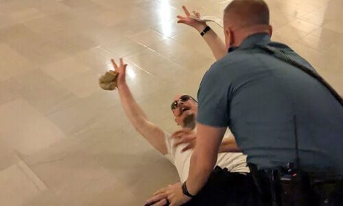 Black Mass Satanic Grotto Satanist leader Michael Stewart tried to deck a kid in the kansas capital and instantly got heemed by cops. Goes from screaming "hail satan and the dread demons of the pit, etc. etc." to "I am not resisting I am not resisting" pic.twitter.com/FwkAIm68QM