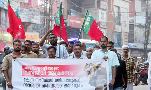 മുണ്ടക്കയം: ചെന്നപ്പാറയില് കാട്ടാനയുടെ ആക്രമണത്തില് വീട്ടമ്മ കൊല്ലപ്പെട്ടതില് പ്രതിഷേധിച്ച് എസ്ഡിപിഐ മുണ്ടക്കയം പഞ്ചായത്ത് കമ്മിറ്റി മുണ്ടക്കയം ടൗണില് പ്രതിഷേധ റാലി നടത്തി. വന്യജീവി അക്രമണത്തിന് കേന്ദ്ര-സംസ്ഥാന സര്ക്കാരുകള് ശാശ്വത പരിഹാരം കാണണമെന്ന് ആവശ്യപ്പെട്ട് നടത്തിയ പ്രതിഷേധം എസ്ഡിപിഐ പൂഞ്ഞാര് മണ്ഡലം സെക്രട്ടറി റഷീദ് മുക്കാലി ഉദ്ഘാടനം ചെയ്തു. മനുഷ്യജീവന് പുല്ലുവില കല്പ്പിക്കാത്ത സര്ക്കാരാണ് കേരളം ഭരിക്കുന്നതെന്ന് അദ്ദേഹം പറഞ്ഞു.