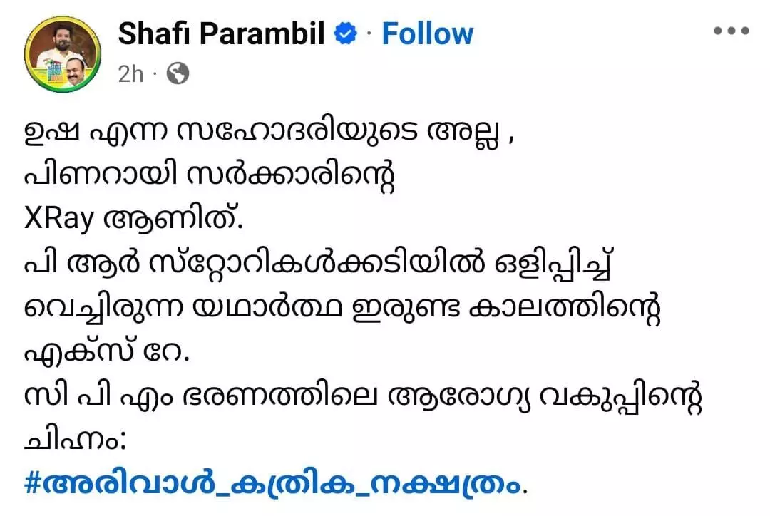 ഉഷയുടേതല്ല, പിണറായി സര്ക്കാരിന്റെ എക്സറേയാണിതെന്ന് ഷാഫി പറമ്പില്