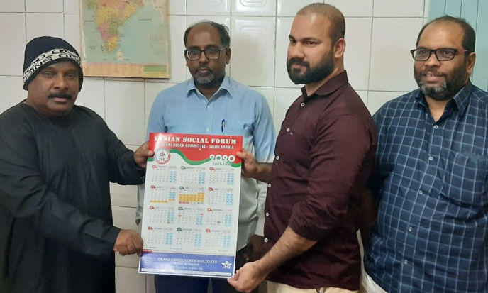 സോഷ്യല് ഫോറം കേരള സ്റ്റേറ്റ് സെക്രട്ടറി ഉസ്മാന് മുഹമ്മദ്, അല്ഖര്ജ് ബ്ലോക്ക് പ്രസിഡന്റ് മഹ്ജൂബ് കെലോത്തിന് കൈമാറി കലണ്ടര് പ്രകാശനം ചെയ്തു. ചടങ്ങില് സോഷ്യല് ഫോറം പ്രതിനിധികളായ സ്റ്റേറ്റ് കമ്മിറ്റി എക്സിക്യൂട്ടീവ് അംഗം അഷ്റഫ് വേങ്ങൂര്, അല്ഖര്ജ് ബ്ലോക്ക് വൈസ്പ്രസിഡന്റ് മുഹമ്മദ് ശൈഖ് മധുര, ജനറല് സെക്രട്ടറി മുഹമ്മദ്, സെക്രട്ടറി അസീബ് എന്നിവര് പങ്കെടുത്തു