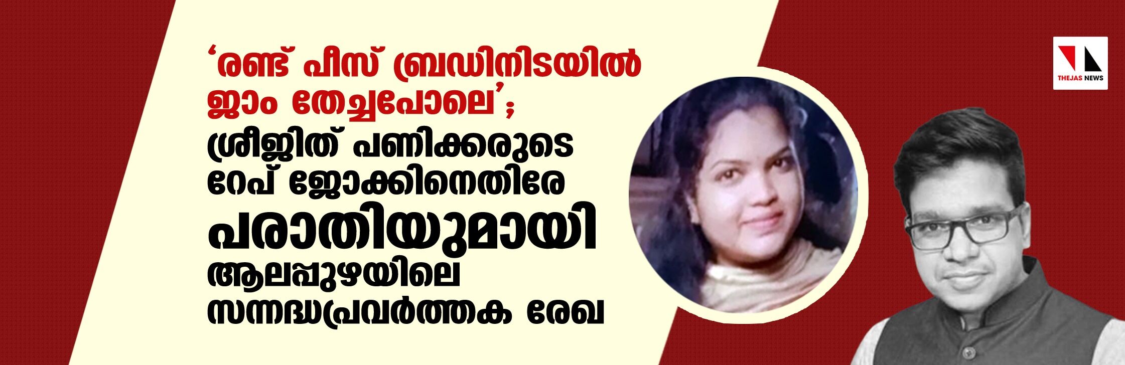 'രണ്ട് പീസ് ബ്രഡിനിടയില് ജാം തേച്ചപോലെ'; ശ്രീജിത് പണിക്കരുടെ റേപ് ജോക്കിനെതിരേ പരാതിയുമായി ആലപ്പുഴയിലെ സന്നദ്ധപ്രവര്ത്തക രേഖ