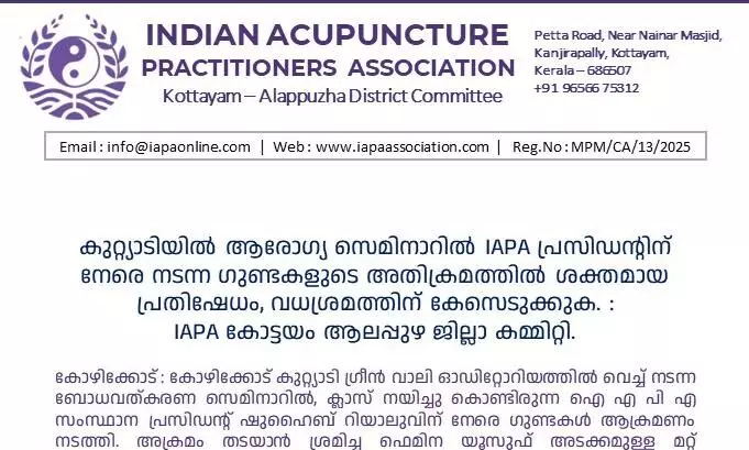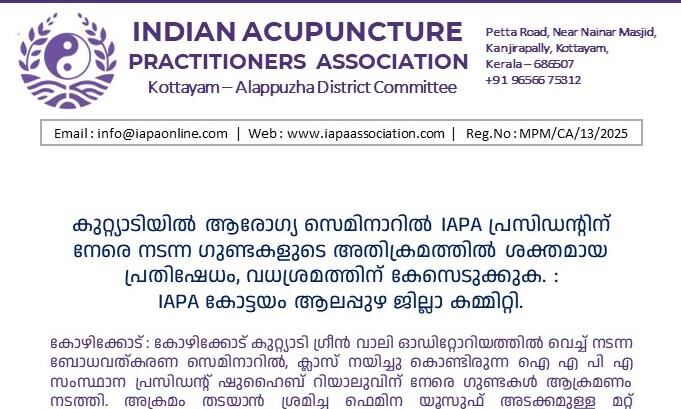 കുറ്റ്യാടിയില് ആരോഗ്യ സെമിനാറില് ഐഎപിഎ പ്രസിഡന്റിനു നേരെ നടന്ന ഗുണ്ടകളുടെ അതിക്രമത്തില് ശക്തമായ പ്രതിഷേധം, വധശ്രമത്തിന് കേസെടുക്കുക: ഐഎപിഎ കോട്ടയം-ആലപ്പുഴ ജില്ലാ കമ്മിറ്റി