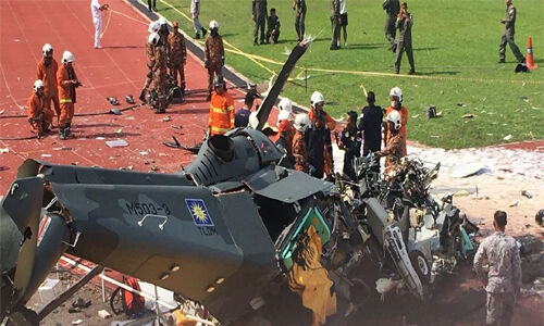റോയല് മലേഷ്യന് നേവിയുടെ യൂറോകോപ്റ്റര് AS555SN ഫെനാക്, അഗസ്റ്റവെസ്റ്റ്ലാന്ഡ് എഡബ്ല്യു139 എന്നീ ഹെലികോപ്റ്ററുകളാണ് അപകടത്തില് പെട്ടത്. കൂട്ടിയിടിക്ക് ശേഷം അഗസ്റ്റവെസ്റ്റ്ലാന്ഡ് എഡബ്ല്യു139 ഹെലികോപ്റ്റര് സ്പോര്ട്സ് കോംപ്ലക്സ് സ്റ്റേഡിയത്തിന്റെ ഇരിപ്പിടത്തിലേക്കും യൂറോകോപ്റ്റര് AS555SN ഫെനാക് സമീപത്തെ നീന്തല്ക്കുളത്തിലേക്കുമാണ് തകര്ന്നുവീണത്. യൂറോകോപ്റ്ററില് മൂന്നുപേരും അഗസ്റ്റയില് ഏഴുപേരുമാണ് ഉണ്ടായിരുന്നതെന്നും മലേഷ്യന് മാധ്യമങ്ങള് റിപോര്ട്ട് ചെയ്തു.
