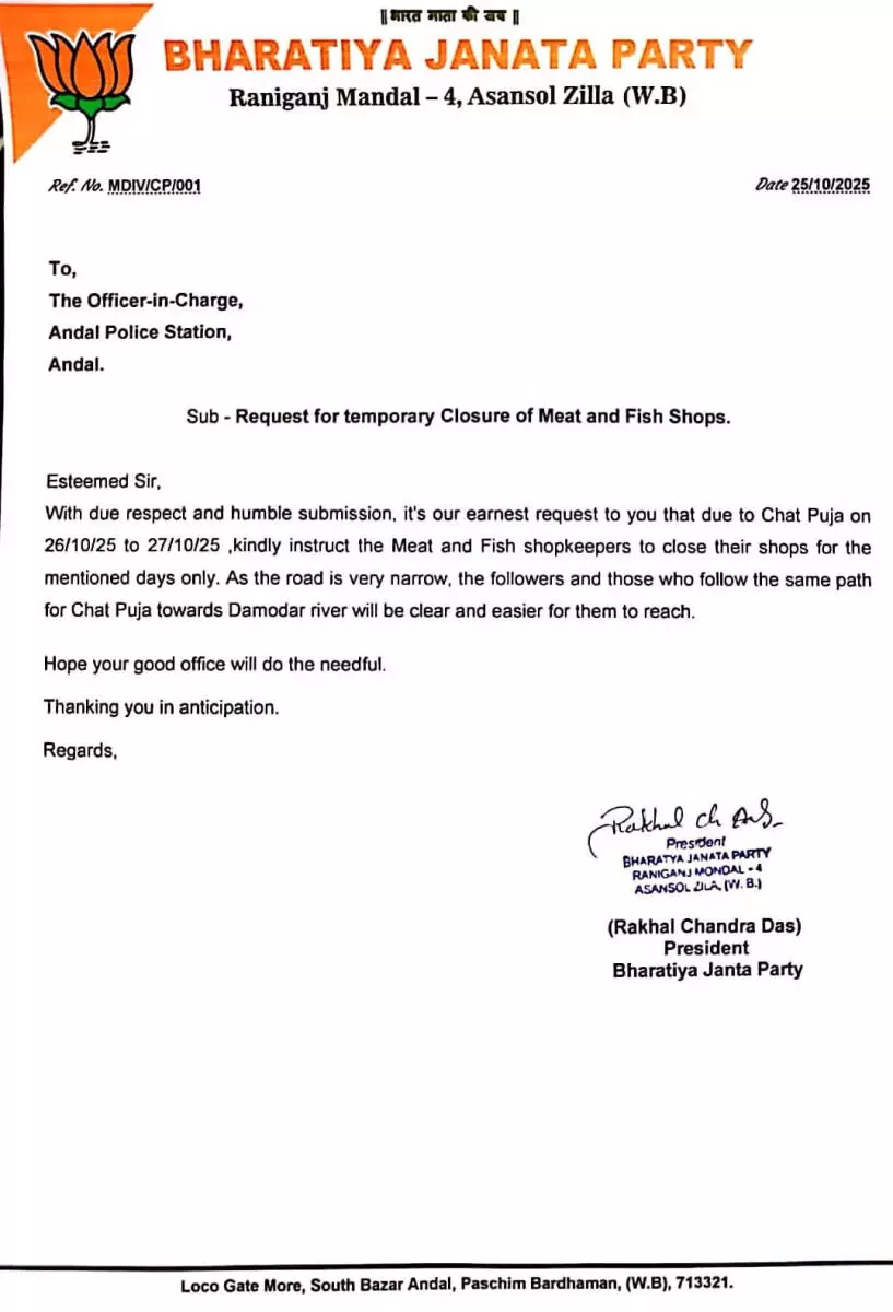 ഒക്ടോബര് 25 ന്, ബിജെപിയുടെ റാണിഗഞ്ച് മണ്ഡല് -4 ന്റെ പ്രസിഡന്റായ രാഖല് ചന്ദ്ര ദാസ്, ഛാത്ത് ചടങ്ങ് നടക്കുന്നതിന്റെ അന്ന് മല്സ്യമാംസ കടകള് തുറക്കാതിരിക്കാനുള്ള നിര്ദേശം നല്കാനും ആവശ്യമായ നടപടികള് സ്വീകരിക്കാനും വേണ്ടി പോലിസിന് കത്തെഴുതി. ഛാത്ത് ഭക്തര് ദാമോദര് നദിയിലേക്ക് പോകുന്ന വഴിയില് മാംസവും മീനും വില്ക്കുന്നത് അവര്ക്ക് അസൗകര്യം സൃഷ്ടിക്കുമെന്നും കത്തില് ചൂണ്ടിക്കാട്ടി.