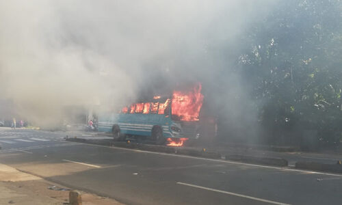 ഗിയര്ബോക്സില് നിന്നാണ് തീപടര്ന്നതെന്ന് ദൃക്സാക്ഷികള് പറഞ്ഞു. ഡ്രൈവര് ഉടന് തന്നെ വണ്ടി നിര്ത്തി യാത്രക്കാരെ ഇറക്കിയതിനാല് ആര്ക്കും പരിക്കില്ല. ബസ് പൂര്ണമായും കത്തി നശിച്ചു.