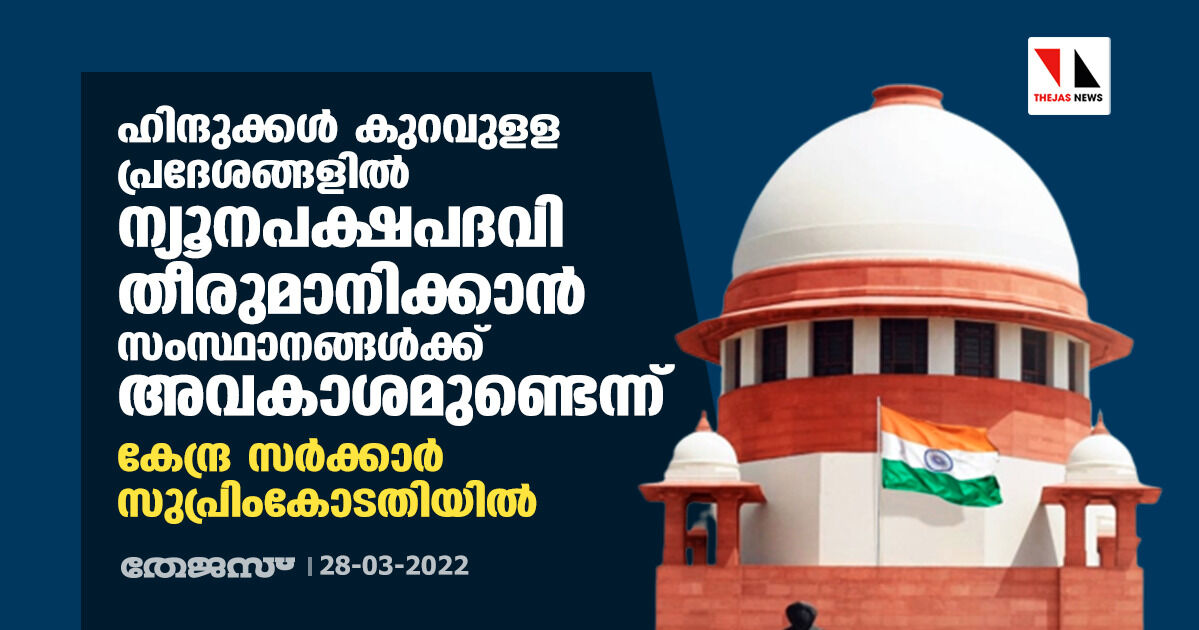 ഹിന്ദുക്കള് കുറവുളള പ്രദേശങ്ങളില് ന്യൂനപക്ഷപദവി തീരുമാനിക്കാന് സംസ്ഥാനങ്ങള്ക്ക് അവകാശമുണ്ടെന്ന് കേന്ദ്ര സര്ക്കാര് സുപ്രിംകോടതിയില്