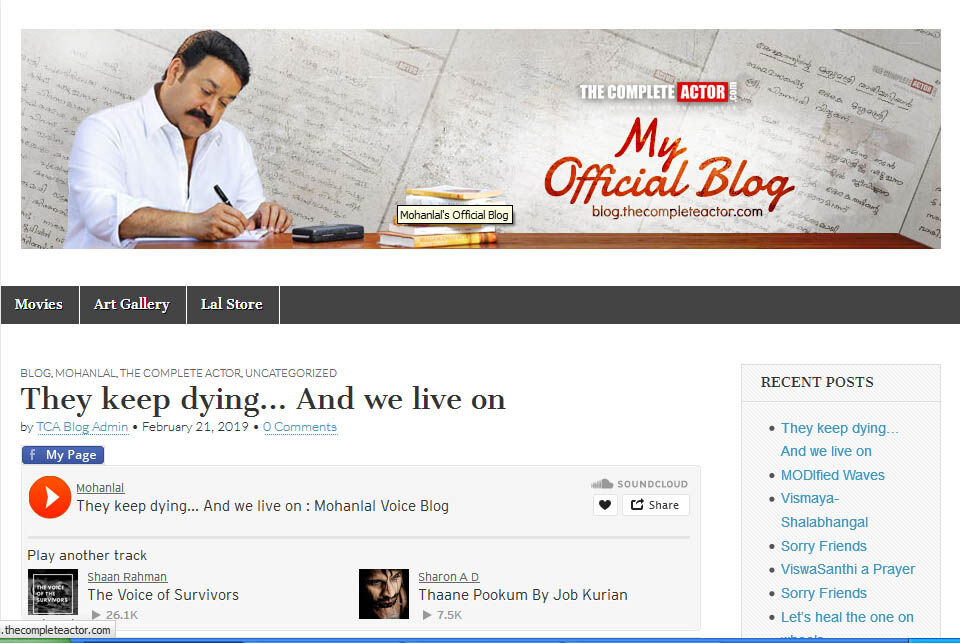പുല്വാമയിലെ സായുധാക്രമണത്തെയും പെരിയയിലെ രാഷ്ട്രീയ കൊലപാതകത്തെയും അപലപിച്ച് നടന് മോഹന്ലാലിന്റെ പുതിയ ബ്ലോഗ്. അവര് മരിച്ചുകൊണ്ടേയിരിക്കുന്നു, നാം ജീവിക്കുന്നു' എന്ന തലക്കെട്ടിലാണ് ലേഖനം ആരംഭിക്കുന്നത്.