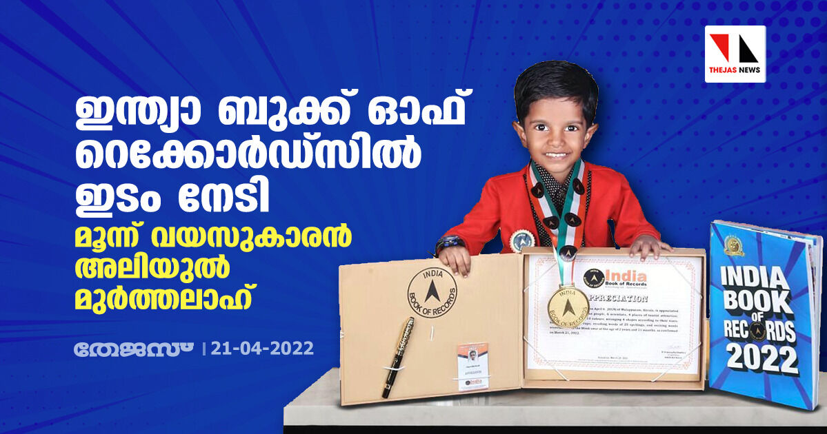 ഇന്ത്യാ ബുക്ക് ഓഫ് റെക്കോര്ഡ്സില് ഇടം നേടി മൂന്ന് വയസുകാരന് അലിയുല് മുര്ത്തലാഹ്
