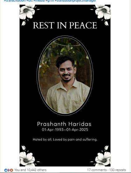 ബെംഗളൂരു: മൂന്ന് വര്ഷത്തോളം തൊഴിലിനു വേണ്ടി ശ്രമിച്ചിട്ടും ജോലി ലഭികാകതെ വന്നപ്പോള് ലിങ്ക്ഡ്ഇനില് സ്വന്തം മരണവാര്ത്ത പോസ്റ്റ് ചെയ്ത് യുവാവ്. ബെംഗളൂരുവിലാണ് സംഭവം. പോസ്റ്റിന് സോഷ്യല് മീഡിയയില് വലിയ പ്രതികരണമാണ് ഉണ്ടായത്. ഇതിനോടകം പോസറ്റ് വൈറലാവുകയും ചെയ്തു.