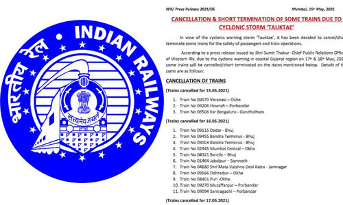 ടൗട്ടെ: വെസ്റ്റേണ് റെയില്വേ അറുപതോളം ട്രയിനുകള് റദ്ദാക്കി; എറണാകുളം-ഓക്ക അഹമ്മദാബാദില് സര്വീസ് അവസാനിപ്പിച്ചു
