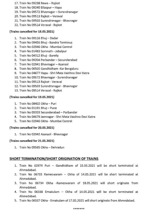 ഗാന്ധിധാം പുരി എക്സ്പ്രിസ് അഹമ്മദാബാദില് സര്വീസ് അവസാനിപ്പിച്ചു, രാമേശ്വരം-ഓക്ക, എറണാകുളം-ഓക്ക, ഓക്ക - എറണാകുളം എക്സ്പ്രസുകളും സര്വീസ് അഹമ്മദാബാദില് വച്ച് സര്വീസ് അവസാനിപ്പിച്ചു.