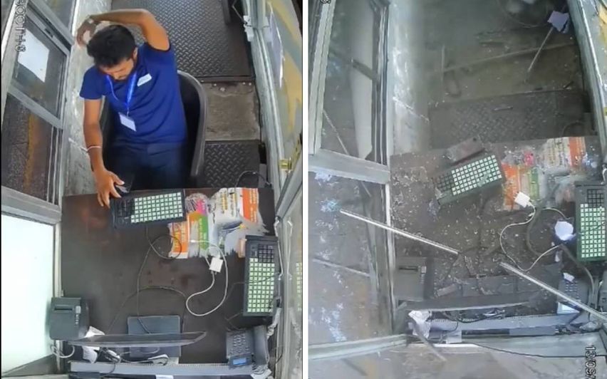 കമ്പ്യൂട്ടറിൽ ജോലി ചെയ്യുന്നതിനിടെയാണ് പുറത്തു പാർക്ക് ചെയ്തിരുന്ന ട്രക്കിന്റെ ടയർ ഉയർന്ന ശബ്ദത്തോടെ പൊട്ടിയത്. ആഘാതത്തിൽ ടോൾ ബൂത്തിന്റെ ജനൽപ്പാളി തകർന്നു ജീവനക്കാരന്റെ മേൽ വീണു. കമ്പ്യൂട്ടർ അടക്കമുള്ള ഉപകരണങ്ങളും നശിച്ചു. ജീവനക്കാരന് പരിക്കുകളൊന്നുമില്ല. സംഭവത്തിന്റെ ദൃശ്യങ്ങൾ സിസിടിവിയിൽ പതിഞ്ഞിട്ടുണ്ട്.