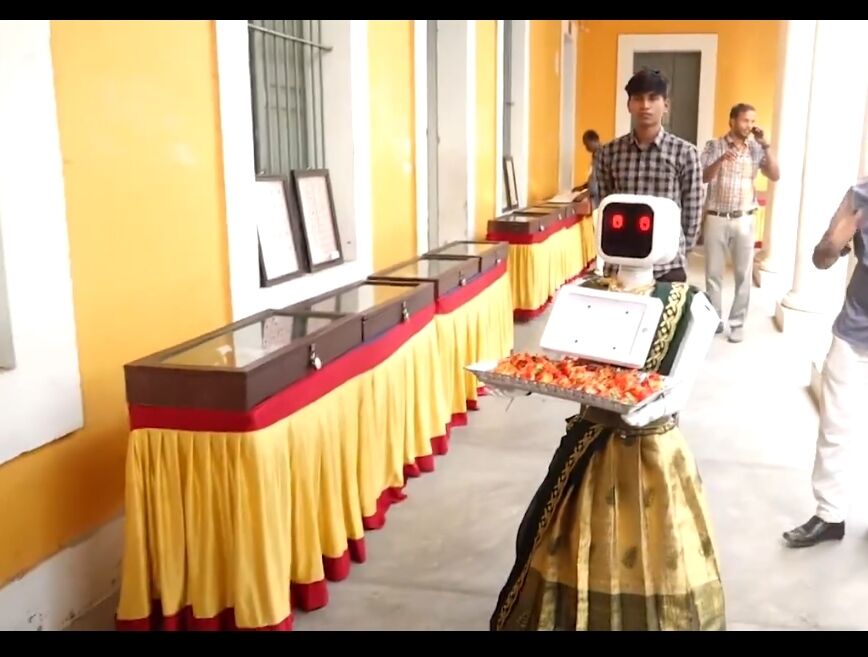 പുതുച്ചേരിയിൽ വോട്ടർമാരെ പൂക്കൾ നൽകി സ്വീകരിച്ച് റോബോർട്ട്, വീഡിയോ