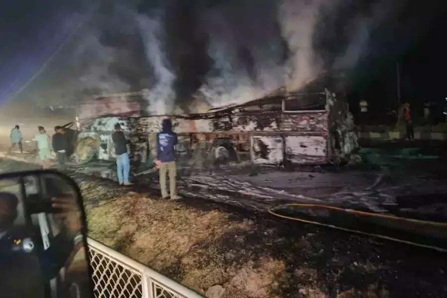 ഹിരിയൂരിൽ നിന്ന് ബെംഗളൂരുവിലേക്ക് പോവുകയായിരുന്ന ലോറി ഡിവൈഡർ മറികടന്ന് എതിർദിശയിൽ വന്ന ബസിലേക്കാണ് ഇടിച്ചുകയറിയത്. ശക്തമായ ഇടിയുടെ ആഘാതത്തിൽ ബസിൽ തീപിടിക്കുകയും വാഹനം പൂർണമായും കത്തിനശിക്കുകയും ചെയ്തു. തീപിടിത്തം അതിവേഗം പടർന്നതിനാൽ യാത്രക്കാരെ രക്ഷപ്പെടുത്തുന്നതിൽ വലിയ ബുദ്ധിമുട്ടുകൾ നേരിട്ടതായി അധികൃതർ പറഞ്ഞു.