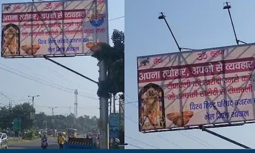 ഭോപ്പാല്: ദീപാവലി ആഘോഷിക്കാനുള്ള വാങ്ങലുകള് ഹിന്ദുക്കളുടെ കടകളില് നിന്ന് മതിയെന്ന് ഹിന്ദുത്വ സംഘടനയായ ബജ്റങ് ദള്. മധ്യപ്രദേശിലെ ഭോപ്പാലിലാണ് ബജ്റങ് ദള് അത്തരം പോസ്റ്ററുകളും ബാനറുകളും സ്ഥാപിച്ചത്. ഹിന്ദുക്കള്ക്കിടയില് ബോധവല്ക്കരണത്തിനാണ് ശ്രമിക്കുന്നതെന്ന് വിഎച്ച്പി നേതാവ് ജിതേന്ദ്ര ചൗഹാന് അവകാശപ്പെട്ടു.