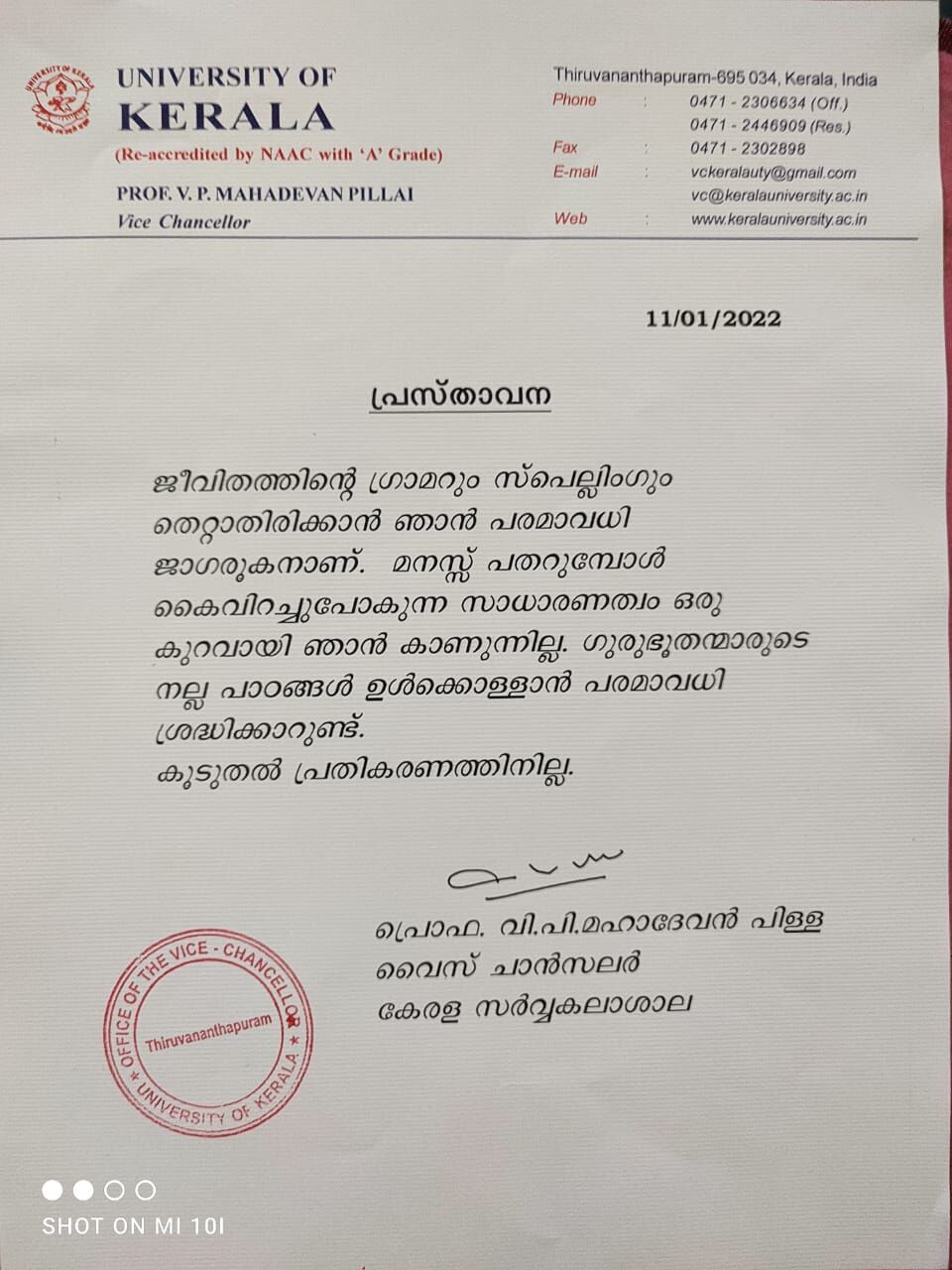 വിസി അയച്ച കത്തിലെ തെറ്റുകള് ചൂണ്ടിക്കാട്ടി ഗവര്ണര് ആരിഫ് മുഹമ്മദ് ഖാന് ആക്ഷേപിച്ചതിനാണ് മറുകുറുപ്പ് ഇറക്കിയത്. രാഷ്ട്രപതിക്ക് ഡിലിറ്റ് നല്കാന് കഴിയില്ലെന്നായിരുന്നു കത്തിലെ പരാമര്ശം. ഈ കത്തിലെ അക്ഷരതെറ്റുകളാണ് തന്നെ ലജ്ജിപ്പിച്ചതെന്ന് ഗവര്ണര് കഴിഞ്ഞ ദിവസം മാധ്യമങ്ങളോട് പറഞ്ഞു.