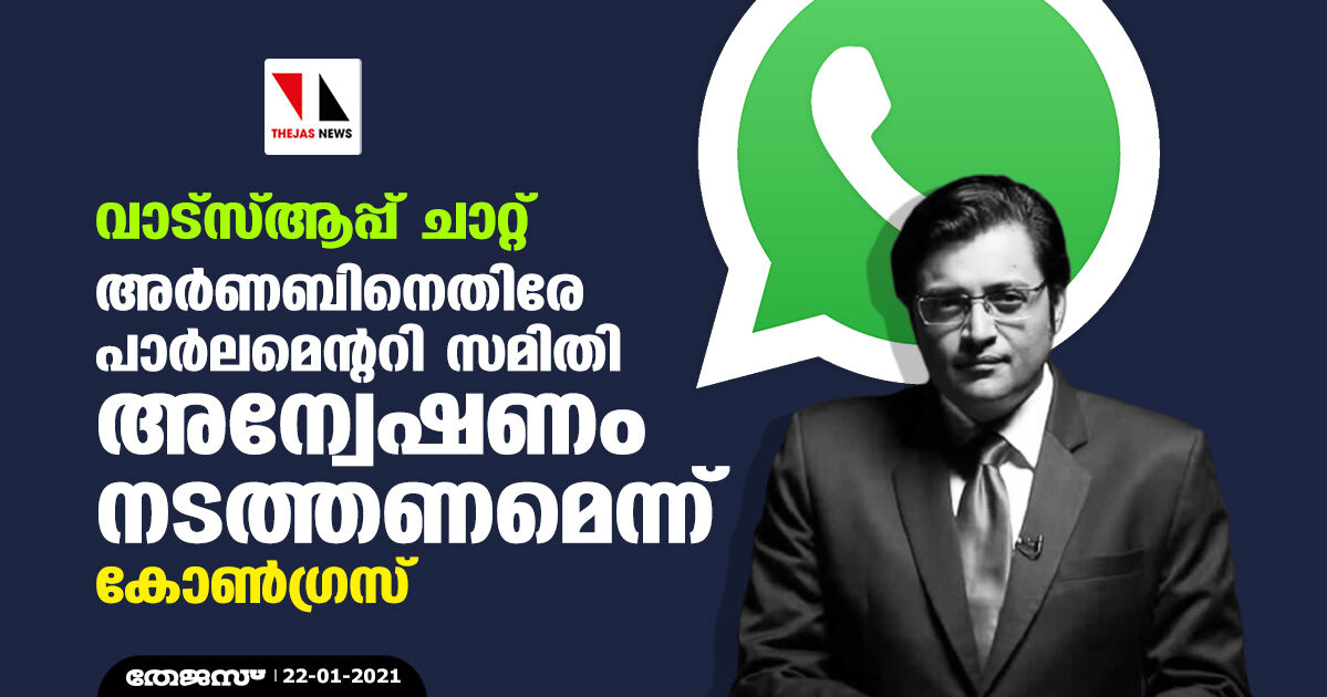 വാട്സ്ആപ്പ് ചാറ്റ്: അര്ണബിനെതിരേ പാര്ലമെന്ററി സമിതി അന്വേഷണം നടത്തണമെന്ന് കോണ്ഗ്രസ്