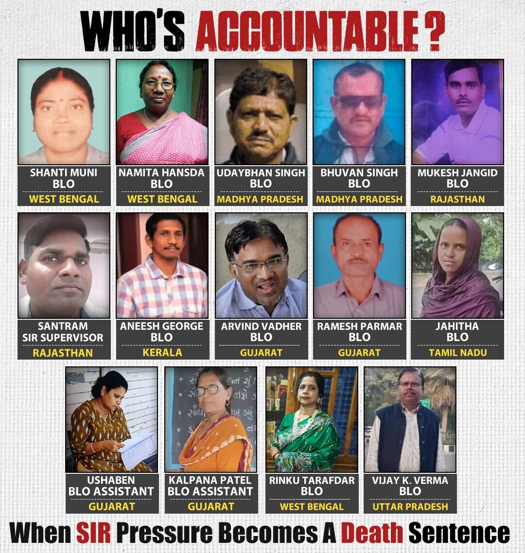 കോണ്ഗ്രസ് പുറത്തു വിട്ടതു പ്രകാരം ഇതുവരെ 14 പേര്ക്കാണ് എസ്ഐആര് സമ്മര്ദം മൂലം ജീവന് നഷ്ടമായത്. കണ്ണൂരില് ആത്മഹത്യ ചെയ്ത ബിഎല്ഒ അനീഷ് ജോര്ജ്, ശാന്തി മുനി(പശ്ചിമബംഗാള്), നമിത ഹന്സ്ദ(പശ്ചിമബംഗാള്), റിങ്കു തരാഫ്ദര്(പശ്ചിമബംഗാള്), ഉദയ്ഭന് സിങ്(മധ്യപ്രദേശ്), ഭുവന് സിങ്(മധ്യപ്രദേശ്), മുകേഷ് ജന്ഗിദ്(രാജസ്ഥാന്), ശാന്താറാം(രാജസ്ഥാന്), അരവിന്ദ് വദാര്(ഗുജറാത്ത്), ഉഷാബെന്(ഗുജറാത്ത്), കല്പ്പന പട്ടേല്(ഗുജറാത്ത്), രമേഷ് പര്മാര്(ഗുജറാത്ത്), ജാഹിത(തമിഴ്നാട്), വിജയ് കെ വര്മ(ഉത്തര്പ്രദേശ്) എന്നിവരാണ് മരണപ്പെട്ടവര്.