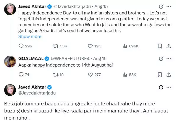 തൊട്ടുപിന്നാലെ, ' നിങ്ങള്ക്ക് ഓഗസ്റ്റ് 14 ന് സ്വാതന്ത്ര്യദിനാശംസകള് ' എന്നൊരു കമന്റ് വരികയായിരുന്നു.ഇതോടെ ശക്തമായ മറുപടിയുമായി അക്തര് തിരിച്ചടിച്ചു. മകനേ, നിന്റെ പൂര്വികര് ബ്രിട്ടീഷുകാരുടെ ഷൂ നക്കുമ്പോള്, എന്റെ പൂര്വികര് സ്വാതന്ത്ര്യത്തിനുവേണ്ടി പണിയെടുക്കുകയായിരുന്നു എന്നായിരുന്നു അദ്ദേഹത്തിന്റെ മറുപടി.