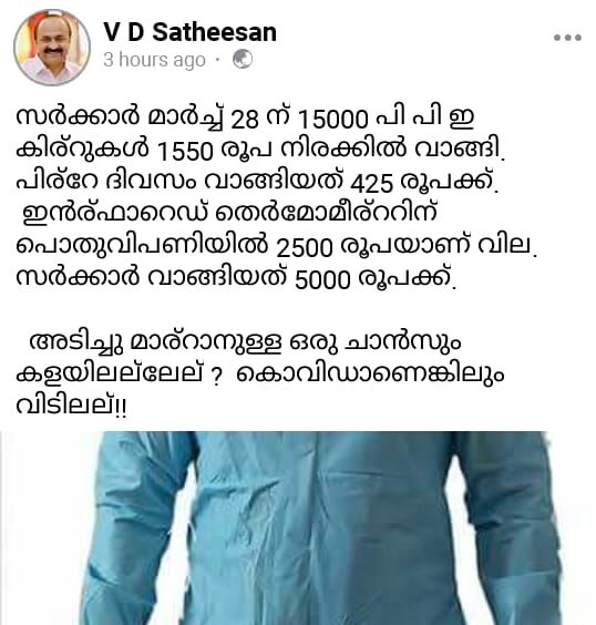 ' സര്ക്കാര് മാര്ച്ച് 28 ന് 15000 പി പി ഇ കിറ്റുകള് 1550 രൂപ നിരക്കില് വാങ്ങി. പിറ്റേ ദിവസം വാങ്ങിയത് 425 രൂപക്ക്. ഇന്ഫ്രാറെഡ് തെര്മോമീറ്ററിന് പൊതുവിപണിയില് 2500 രൂപയാണ് വില. സര്ക്കാര് വാങ്ങിയത് 5000 രൂപക്ക്. അടിച്ചു മാറ്റാനുള്ള ഒരു ചാന്സും കളയില്ലല്ലേ ? കൊവിഡാണെങ്കിലും വിടില്ല.'