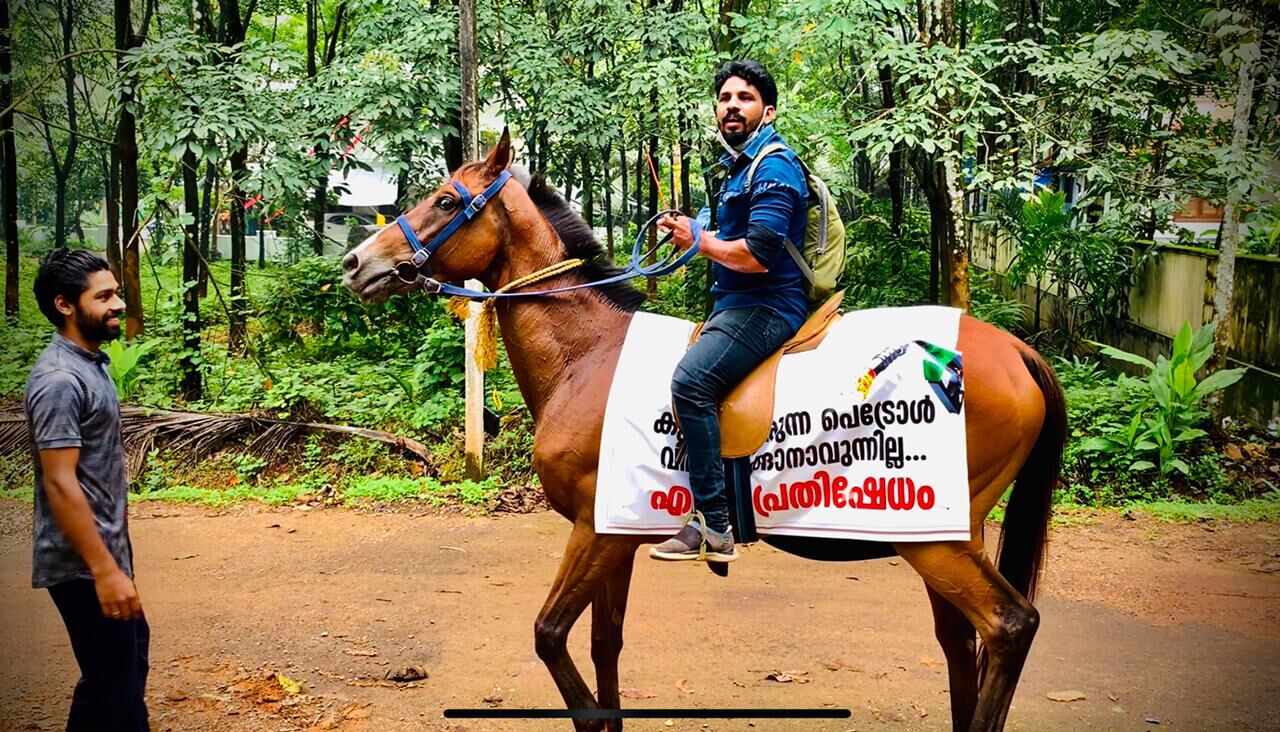 ഓമശ്ശേരി, വെളിമണ്ണ പുല്പ്പറമ്പില് വീട്ടില് മുജീബ് ആണ് പെട്രോളിയം കമ്പനികളുടെ പകല്കൊള്ളയ്ക്കെതിരായ കുതിരപ്പുറത്ത് യാത്ര ചെയ്ത് പ്രതിഷേധിച്ചത്.