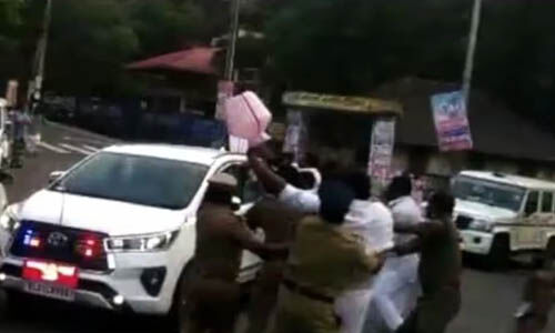മാരാമണ് കണ്വന്ഷന് ഉദ്ഘാടനം കഴിഞ്ഞ് ഇടുക്കിയിലേക്ക് മടങ്ങും വഴിയാണ് ഇരുപതോളം പ്രവര്ത്തകര് ചേര്ന്ന് കരിങ്കൊടി കാണിച്ചും കാലിക്കുടം എറിഞ്ഞും പ്രതിഷേധിച്ചത്. വെള്ളക്കരം കൂട്ടിയതിനെതിരെയാണ് യൂത്ത് കോണ്ഗ്രസിന്റെ പ്രതിഷേധം. പ്രതിഷേധക്കാരെ പോലിസ് അറസ്റ്റ് ചെയ്ത് നീക്കി.