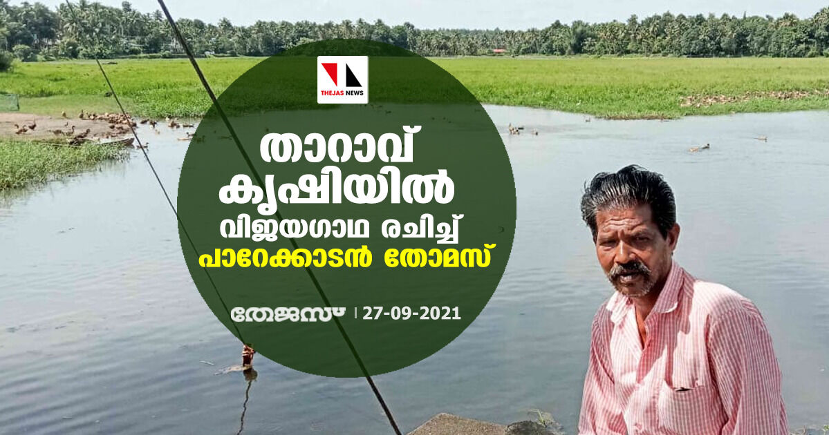 വീടിനോട് ചേര്ന്നുള്ള തിരുമുക്കുളം വയല് പ്രയോജനപ്പെടുത്തി താറാവ് കൃഷി നടത്തുന്നത്. കൊവിഡ് കാലത്ത് മാന്ദ്യം നേരിട്ടുവെങ്കിലും നഷ്ടമില്ലാത്ത കൃഷിയാണ് താറാവ് വളര്ത്തല് എന്നാണ് ഇദ്ദേഹത്തിന്റെ അനുഭവം. താറാവുകള്ക്ക് മേയാന് കഴിയുന്ന പാടശേഖരങ്ങള് കണ്ടെത്തി കൃഷി തുടങ്ങാനാവുമെന്ന് തോമസ് സാക്ഷ്യപടുത്തുന്നു.