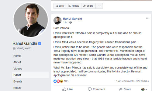 1984ലേത് ഭയാനക ദുരന്തം; സാം പിത്രോദ അതിരുകടന്നെന്ന് രാഹുല്